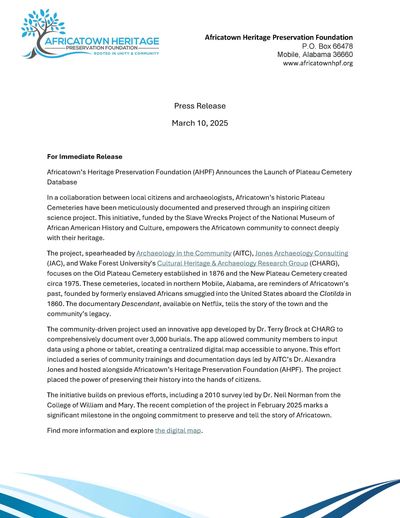 In a collaboration between local citizens and archaeologists, Africatown’s historic Plateau Cemeteries have been meticulously documented and preserved through an inspiring citizen science project. This initiative, funded by the Slave Wrecks Project of the National Museum of African American History and Culture, empowers the Africatown community to connect deeply with their heritage.